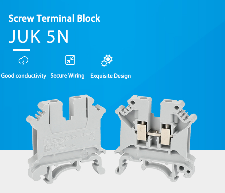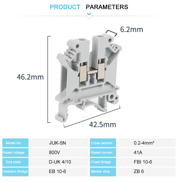 Juk "todistettu turvallinen luotettava" ruuvipäätejärjestelmä peittää/suojaa maadoitusliittimiä, joiden lanka -halkaisijat vaihtelevat välillä 1,5 - 240 mm². Se soveltuu kiinteisiin/monisäikeisiin johtoon ja on valmistettu PA66-liekinlämpötilan nylon + nikkelipinnoitetusta messingistä. Matala kosketusvastus varmistaa luotettavan johtavuuden. Tukee 35 mm DIN -kiskoa välitöntä asennusta ja käyttöä varten. Juk 6N-10n Universal Form -kerroin on yhteensopiva lisävarusteiden, kuten päätykannen ja jakajien kanssa. Se on varustettu täydellä lisävaruste -ekosysteemillä, mukaan lukien sillat, se yksinkertaistaa nopeaa asennus- ja räätälöintivaatimuksia skenaarioissa, kuten teollisuusvoiman jakelu- ja ohjauskaapissa.